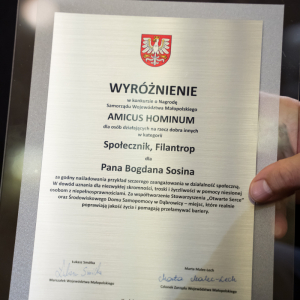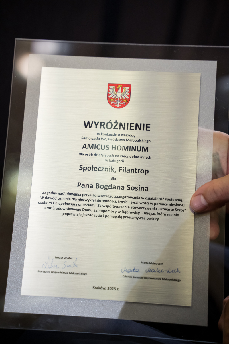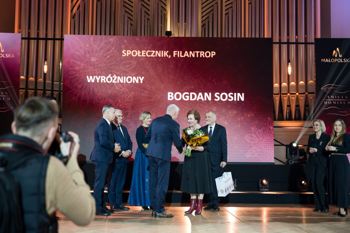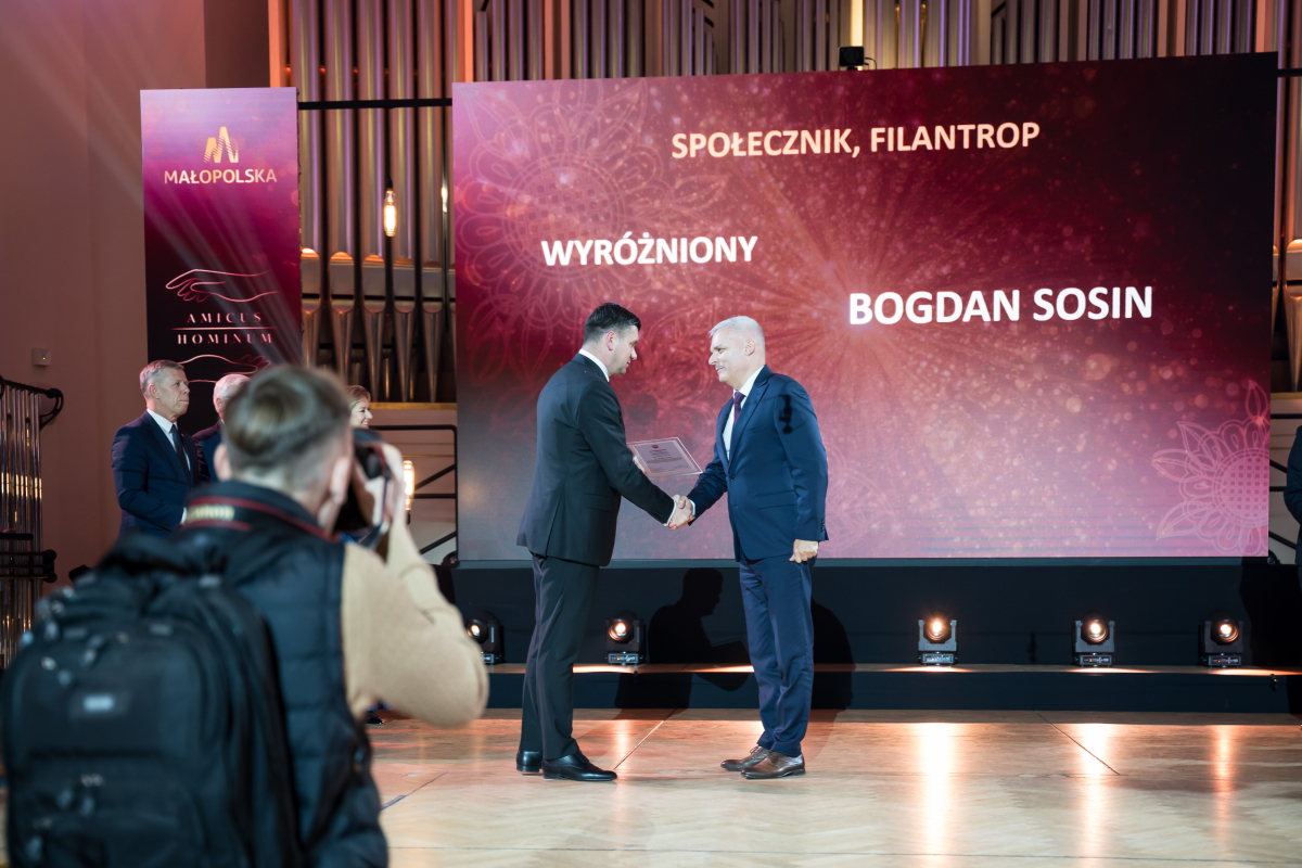 W poniedziałek, 9 grudnia 2025 roku, podczas uroczystej gali w Filharmonii Krakowskiej, mieszkaniec naszej gminy, Pan Bogdan Sosin, otrzymał jedną z najważniejszych nagród społecznych w Małopolsce – „Amicus Hominum”. Wyróżnienie przyznano mu w kategorii SPOŁECZNIK, FILANTROP, za wieloletnią, bezinteresowną działalność na rzecz osób niepełnosprawnych na terenie gminy Szczucin.