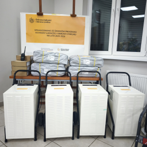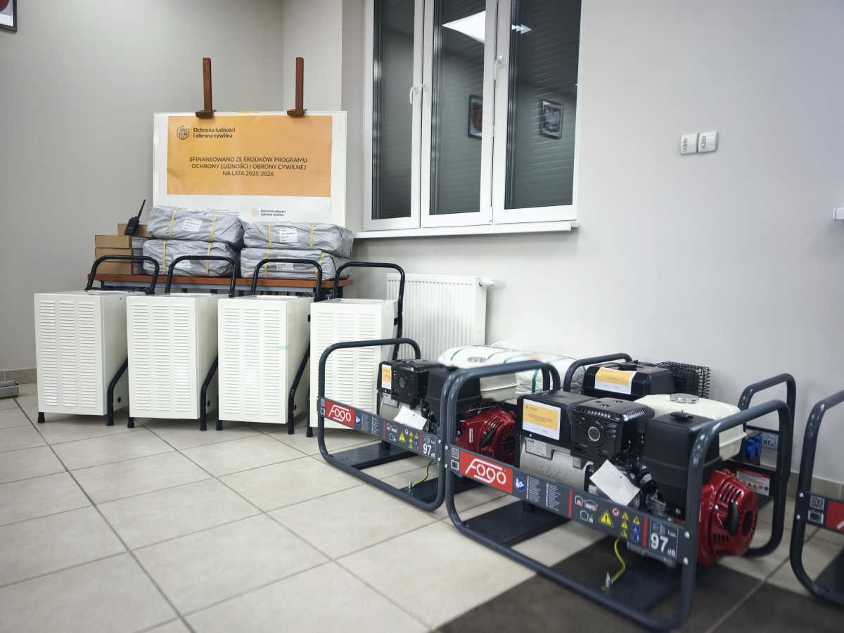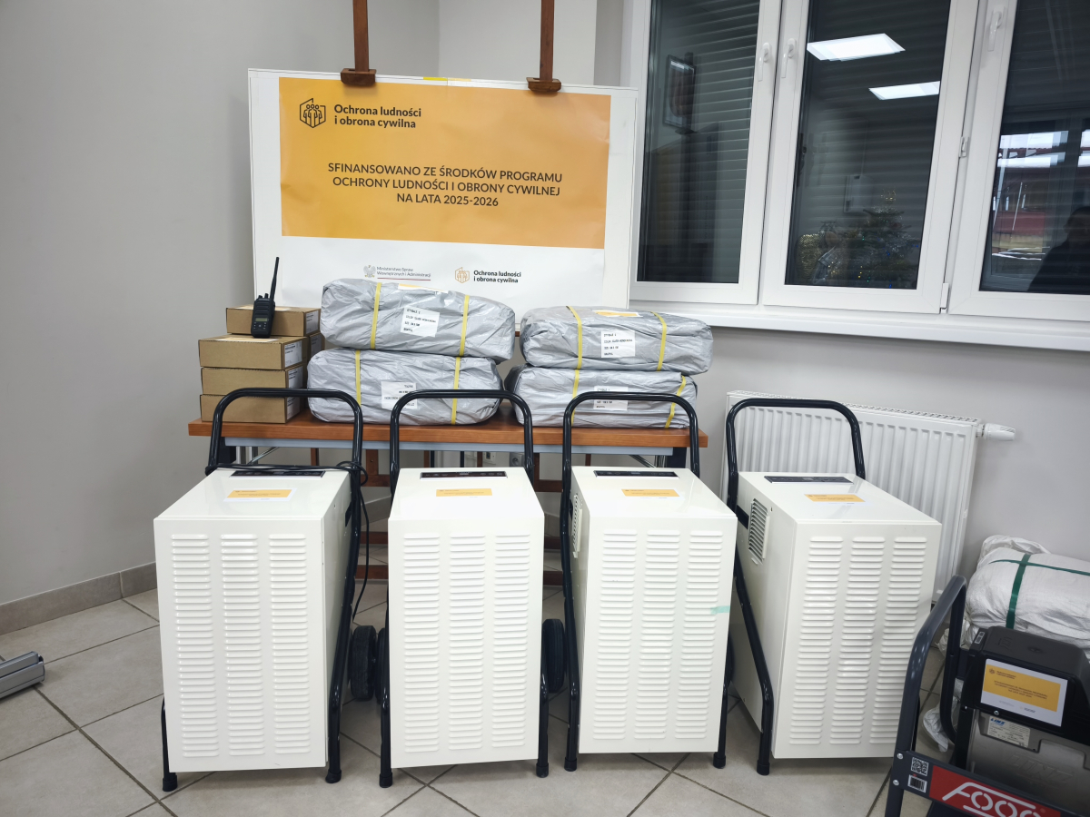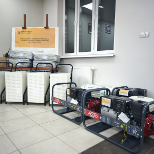 - Zakup sprzętu niezbędnego w sytuacjach kryzysowych: worki przeciwpowodziowe, geowłóknina, osuszacz powietrza, plandeki, radiotelefony przenośne, agregat prądotwórczy,