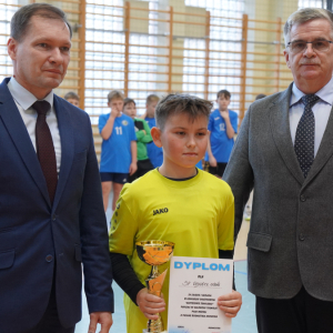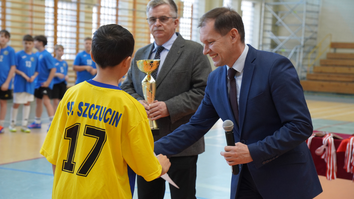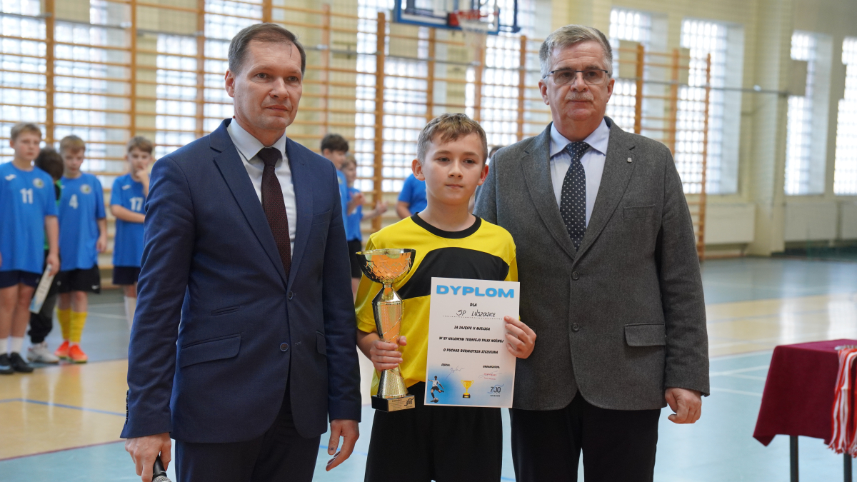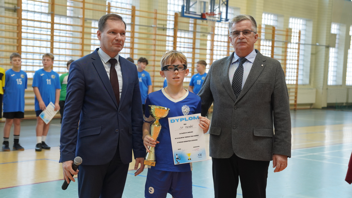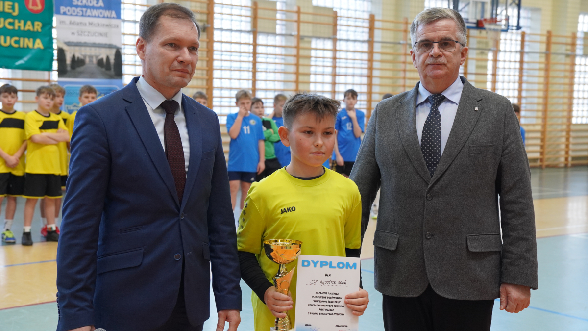 Puchary, medale i dyplomy zwycięzcom wręczali: Burmistrz Szczucina Tomasz Bełzowski i Dyrektor Szkoły Podstawowej w Szczucinie Marek Kupiec.